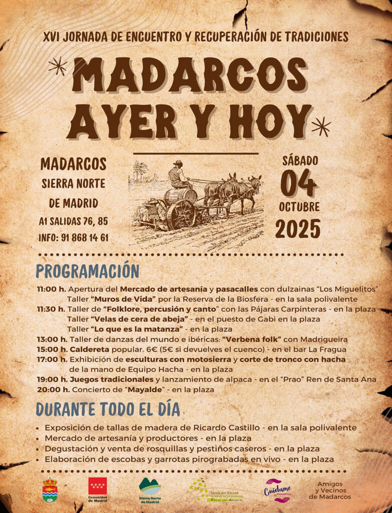 El próximo sábado 4 de octubre, el municipio de Madarcos acogerá la XVI edición de “Madarcos Ayer y Hoy”, una jornada única en la que vecinos y visitantes se dan cita para recuperar, compartir y celebrar las tradiciones serranas.