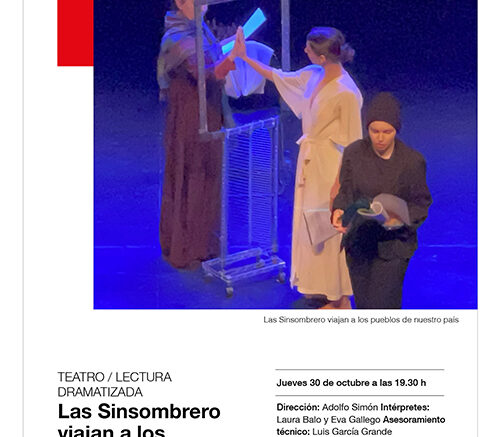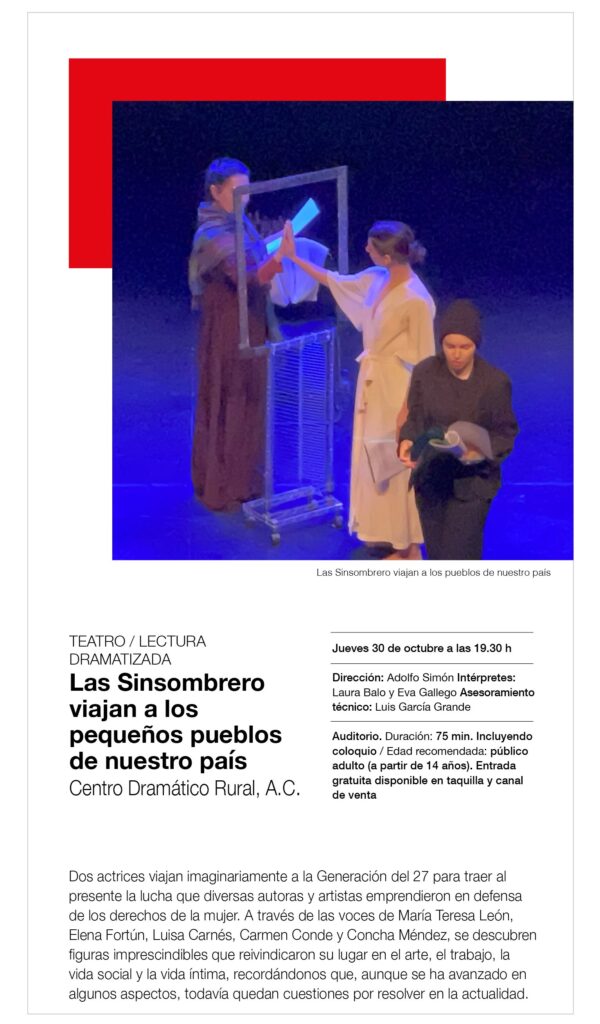 En este contexto se enmarca la lectura dramatizada Las Sinsombrero viajan a los pequeños pueblos de nuestro país, en la que dos actrices contemporáneas viajan imaginariamente a la Generación del 27 para traer al presente la lucha que diversas autoras y artistas emprendieron en defensa de los derechos de la mujer. A través de las voces de María Teresa León, Elena Fortún, Luisa Carnés, Carmen Conde y Concha Méndez, se descubren figuras imprescindibles que reivindicaron su lugar en el arte, el trabajo, la vida social y la vida íntima, recordándonos que, aunque se ha avanzado en algunos aspectos, todavía quedan cuestiones por resolver en la actualidad.