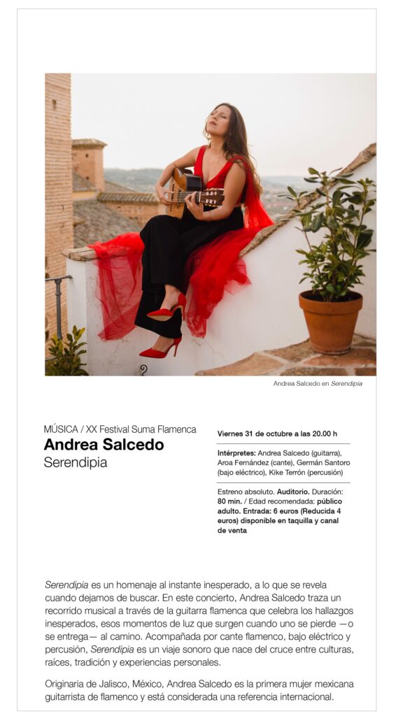 Intérpretes: Andrea Salcedo (guitarra), Aroa Fernández (cante), Germán Santoro (bajo eléctrico), Kike Terrón (percusión). Serendipia es un homenaje al instante inesperado, a lo que se revela cuando dejamos de buscar. En este concierto, Andrea Salcedo traza un recorrido musical a través de la guitarra flamenca que celebra los hallazgos inesperados, esos momentos de luz que surgen cuando uno se pierde —o se entrega— al camino. Acompañada por cante flamenco, bajo eléctrico y percusión, Serendipia es un viaje sonoro que nace del cruce entre culturas, raíces, tradición y experiencias personales, y que encuentra en lo imprevisible una fuente constante de inspiración.