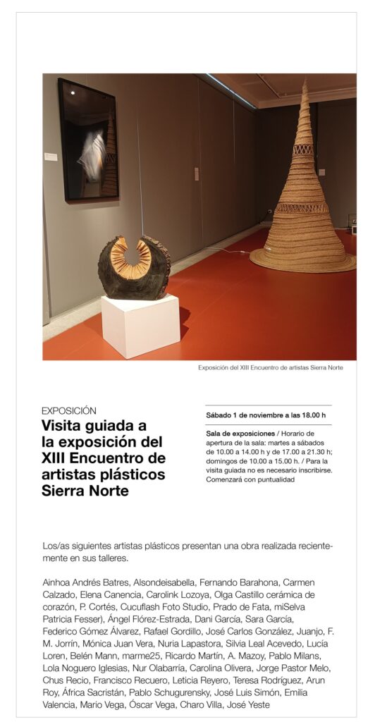XIII ENCUENTRO DE ARTISTAS PLÁSTICOS SIERRA NORTE Una cincuentena de artistas plásticos de la Sierra Norte madrileña se encontrará en una amplia exposición colectiva en el Centro Comarcal de Humanidades, con objeto de respaldar la práctica artística y la producción cultural, y aproximar el arte contemporáneo al público usuario del Centro de Humanidades y a todos sus visitantes.