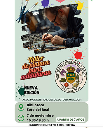 TALLER DE PINTURA PARA MINIATURAS en Soto del Real Publicado por: senda_norte 06/11/20257 de Noviembre – Asociación Modelismo y JuegosA partir de 7 añosInscripciones en la biblioteca