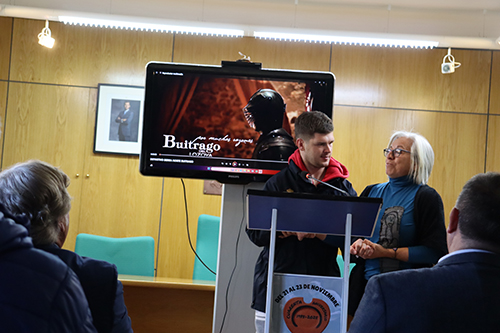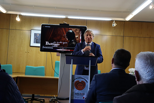Javier del Valle, alcalde de Buitrago, presentó las jornadas, y dio paso a un video donde se veían algunos de los proyectos para el futuro del pueblo; el nuevo Museo, el Matadero, el nuevo Plan General de Urbanismo…