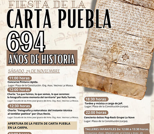El miércoles 3 de diciembre, como es tradición, la Iglesia San Miguel Arcángel acogerá la representación teatral del Privilegio de Repoblación, organizada por la Asociación Cultural Carta Puebla.
