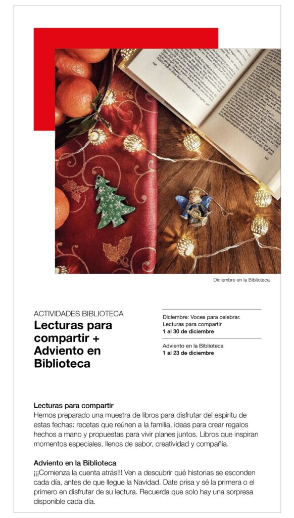 CINE: ROMERÍA – COMPAÑÍA DE TEATRO DE BLANCA MARSILLACH: Versos de mis cuatro esquinas – ACTIVIDADES BIBLIOTECA : Diciembre: Voces para celebrar – Lecturas para compartir – Meriendas y snacks saludables, taller de cocina – NUEVA OFERTA DE TALLERES DE LARGO RECORRIDO