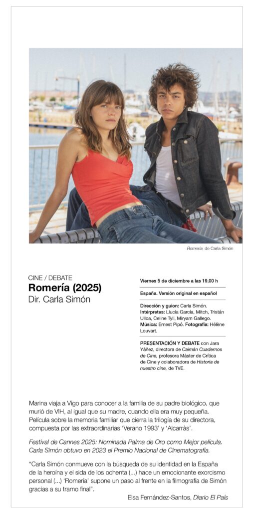 ROMERÍA España (2025). 115 min. Versión original en español. No recomendada para menores de 16 años. Dirección: Carla Simón. Guion: Carla Simón. Intérpretes: Llucía García, Mitch, Tristán Ulloa, Celine Tyll, Miryam Gallego. Música: Ernest Pipó. Fotografía: Hélène Louvart.