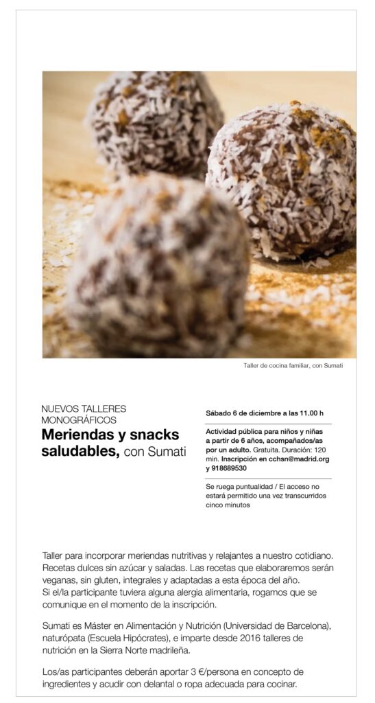 Sábado 6 diciembre, 11.00 a 13.00 h Meriendas y snacks saludables, taller de cocina, con Sumati Taller para incorporar meriendas nutritivas y relajantes a nuestro cotidiano. Recetas dulces sin azúcar y saladas. Las recetas que elaboraremos serán veganas, sin gluten, integrales y adaptadas a esta época del año.