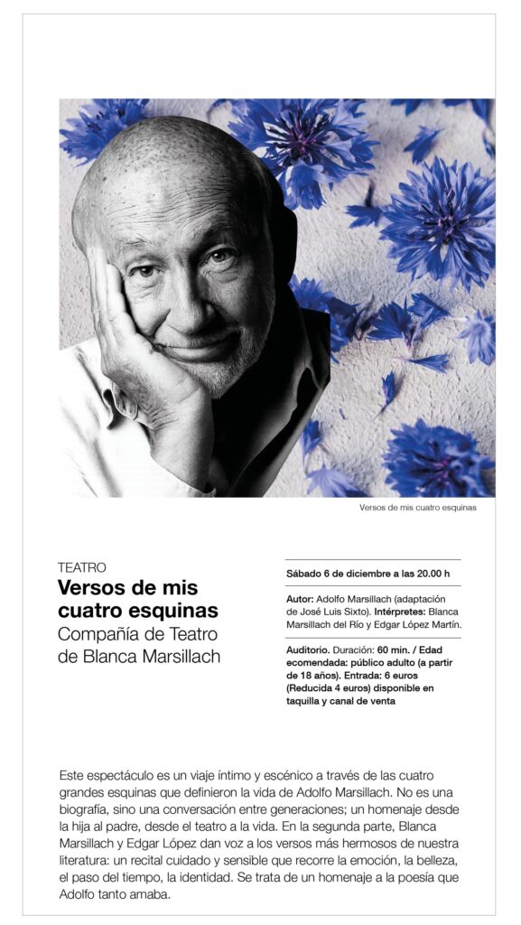 Tras ese viaje íntimo, el espectáculo se abre a la palabra poética. En esta segunda parte, Blanca Marsillach y Edgar López dan voz a los versos más hermosos de nuestra literatura: un recital cuidado y sensible que recorre la emoción, la belleza, el paso del tiempo, la identidad. Desde los clásicos eternos como Neruda, Lorca o Zorrilla, hasta los ecos contemporáneos. Este espectáculo es un homenaje colectivo a la poesía que Adolfo tanto amaba y que supo defender desde las tablas con elegancia y profundidad. En este espacio, la poesía se hace refugio, recuerdo y acto de resistencia. Es también una celebración de la palabra como herencia viva, como legado familiar y cultural.