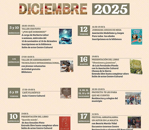 TALLER DE ASESORAMIENTO TECNOLÓGICO INTERGENERACIONAL – CAFÉ FILOSÓFICO – PRESENTACIÓN DEL LIBRO «Querido miedo”, de Ana González Pinto – JORNADAS JUEGOS DE MESA: Asociación Modelismo y Juegos – PRESENTACIÓN DEL LIBRO «Obsesiones y jazmines”, de Luis Fernández Pineda con la Asociación Cultural Chozas de la Sierra – PROYECTO: TE LEO PARA QUE ME CUENTES: Residencias y colegios del municipio – FESTIVAL ABRAPALABRA: UN AUTOR EN LA MALETA con Beatriz Martín Vidal Encuentro internos Centro Penitenciario y alumnos IES Rosa Chacel