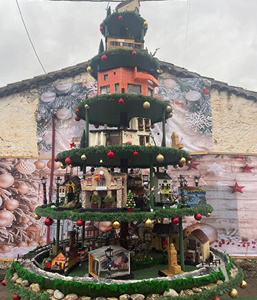 Este año se ha buscado ir más allá de los ornamentos típicos, integrando la historia vida de la población directamente en la festividad. Esta visión se materializó a través de la colaboración excepcional de las mujeres y niños de la localidad. Todos ellos han dedicado su tiempo a la creación de minuciosas maquetas de los edificios más emblemáticos del pueblo. Cada pequeña replica, elaborada con paciencia y cariño, no es solo un adorno, sino una cápsula de la historia arquitectónica y emocional del lugar. Al colocarse a los pies o en las ramas del árbol, estas maquetas transforman la base del pino en un pequeño y luminoso paisaje urbano, el corazón del pueblo en miniatura.