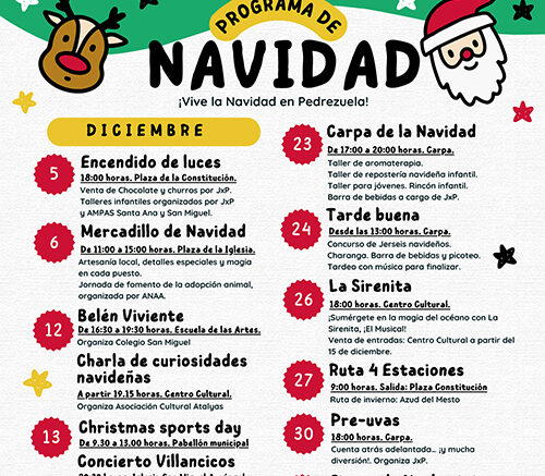 La Carpa de la Navidad será punto de encuentro los días 22 y 23 de diciembre, con talleres y actividades dirigidas a todas las edades. Antes de la celebración de la Nochebuena, la plaza del municipio acogerá al mediodía el novedoso concurso de jerséis navideños, que premiará los diseños más divertidos y originales, en un ambiente animado por una charanga.
