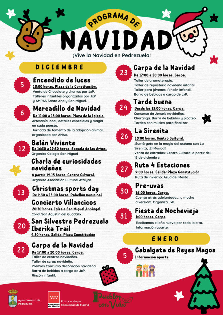 El municipio de Pedrezuela vive plenamente el ambiente navideño tras el encendido oficial de luces el pasado 5 de diciembre y la inauguración del mercadillo navideño al día siguiente. A partir de ahora, vecinos y visitantes podrán disfrutar de un completo programa de actividades culturales, deportivas y festivas pensadas para todos los públicos, que este año ha contado con el patrocinio de la Comunidad de Madrid, dentro del programa Pueblos con Vida.