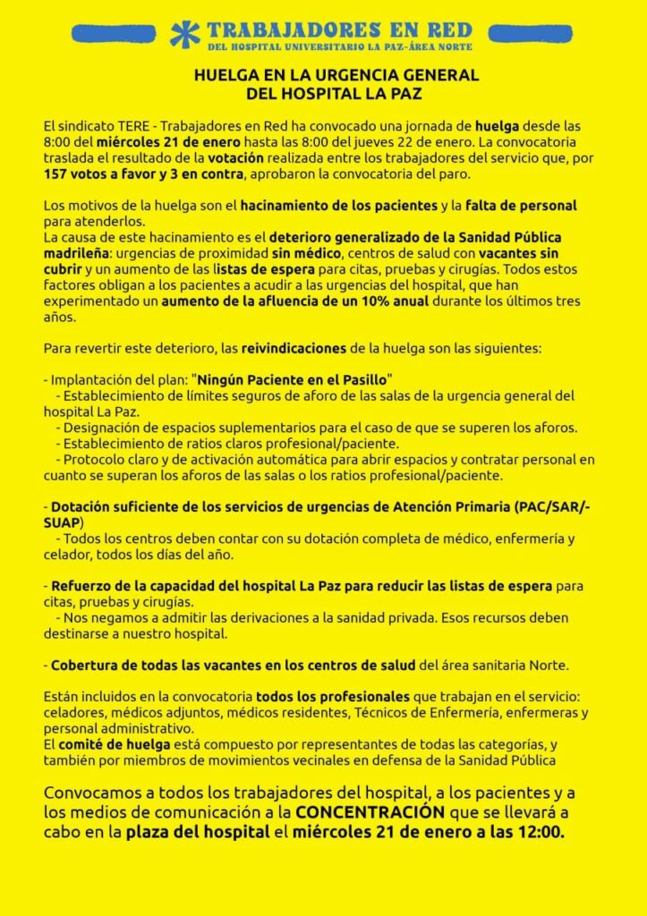 Ante el deterioro de las condiciones, que se están produciendo en el Hospital de La Paz de Madrid, con el hacinamiento de los pacientes, y la falta de personal para atenderlos, se ha convocado una jornada de huelga y una concentración, que se realizará, en las puertas del Hospital, el
