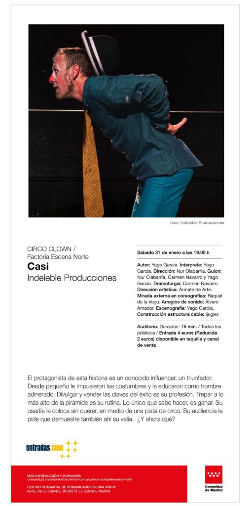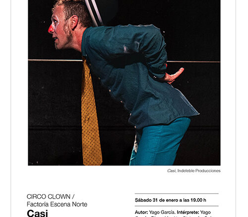 Factoría Escena Norte INDELEBLE PRODUCCIONES Casi Circo Autor: Yago García. Intérprete: Yago García. Dirección: Nur Olabarría. Guion: Nur Olabarría, Carmen Navarro y Yago García. Dramaturgia: Carmen Navarro. Dirección artística: Ármate de Arte. Mirada externa en coreografías: Raquel de la Vega. Arreglos de sonido: Álvaro Amador. Escenografía: Yago García. Construcción estructura cable: Ijugler.