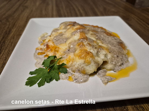 - La Estrella presenta elaboraciones más tradicionales con un toque gourmet, como la tosta de bacalao confitado y gambas al ajillo y el canelón de setas y hongos.