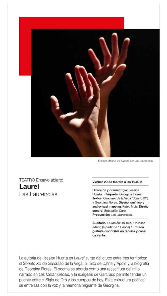 Laurel es la segunda creación escénica de Jessica Huerta dentro de Las Laurencias, investigación sobre la violencia hacia las mujeres en la mitología y el Siglo de Oro desde cuerpos contemporáneos. La obra cruza el Soneto XIII de Garcilaso, el mito de Dafne y Apolo y la biografía de Georgina Flores, bailarina nicaragüense migrante en Madrid. La escena adopta la forma de una audición donde cuerpo y palabra se exponen como prueba, activando el mito en el presente y convirtiendo la metamorfosis en la afirmación de la potencia de un cuerpo que, al exponerse, se transforma, resiste y reclama su voz.
