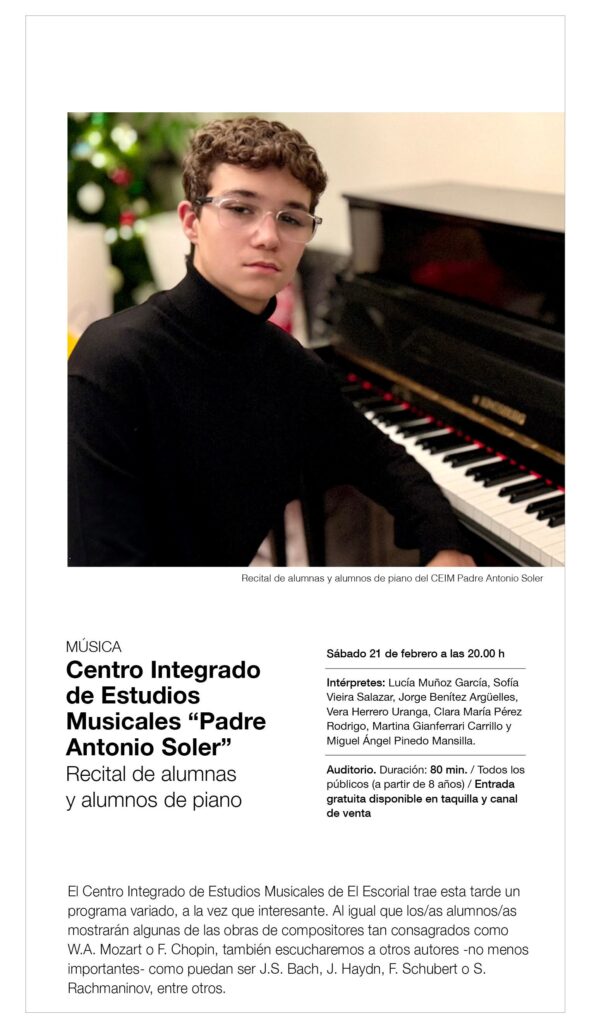 El Centro Integrado de Estudios Musicales de El Escorial trae esta tarde un programa variado, a la vez que interesante. Al igual que los/as alumnos/as mostrarán algunas de las obras de compositores tan consagrados como W.A. Mozart o F. Chopin, también escucharemos a otros autores -no menos importantes- como puedan ser J.S. Bach, J. Haydn, F. Schubert o S. Rachmaninov, entre otros. Músicos de diferentes países, culturas y distintas épocas, pero a los que les unía un objetivo común: expresar su mundo musical interior mediante un instrumento tan grandioso como es el Piano.