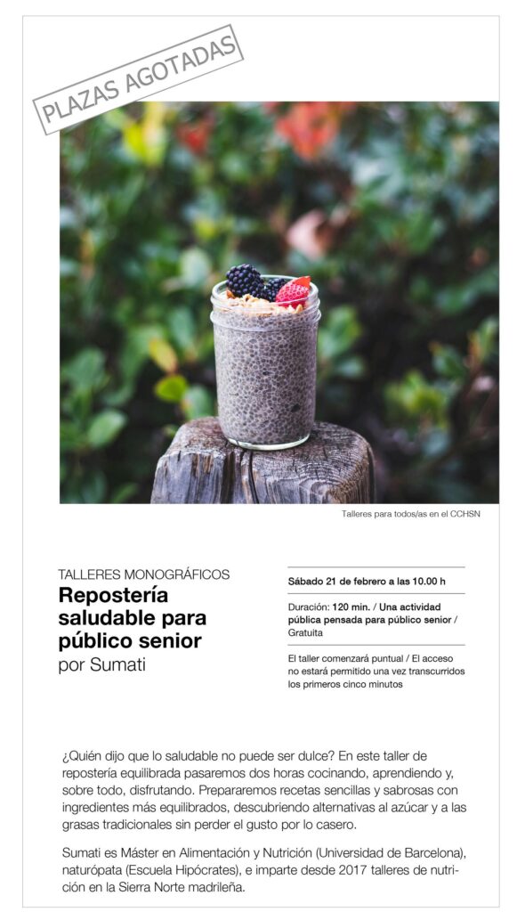 “Repostería saludable para público senior”, con Sumati ¿Quién dijo que lo saludable no puede ser dulce? En este taller de repostería equilibrada pasaremos dos horas cocinando, aprendiendo y, sobre todo, disfrutando. Prepararemos recetas sencillas y sabrosas con ingredientes más equilibrados, descubriendo alternativas al azúcar y a las grasas tradicionales sin perder el gusto por lo casero.