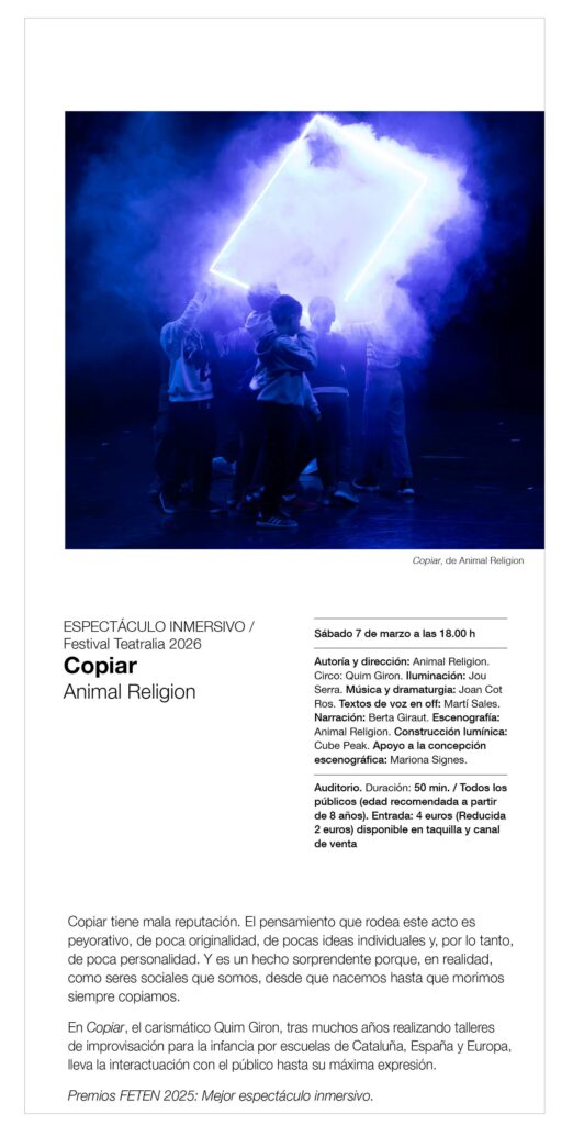 CINE; RECIÉN NACIDAS  – TEATRALIA 2026 – ANIMAL RELIGION “COPIAR” – BIBLIOTECA: Los 12 Hilos – Narrativa del s. XXI escrita por mujeres – Arte Intruso: Santras, por Pedro M. Lapuente – La Sala: Vitae. Vida y luz en la materia, de Leticia Reyero Vitae