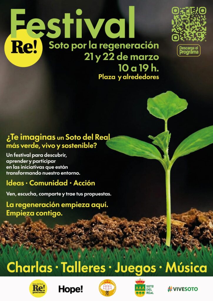 Este festival Re! Soto por la Regeneración, que tendrá lugar en la Plaza de la Villa y el Centro Cultural el 21 y 22 de marzo, nace con el objetivo de dar a conocer iniciativas locales vinculadas a la sostenibilidad, la innovación social y la mejora del entorno urbano y natural. La propuesta está impulsada por el colectivo ciudadano Soto por la Regeneración, en colaboración con el Ayuntamiento de Soto del Real y la Asociación Cultural Chozas de la Sierra.