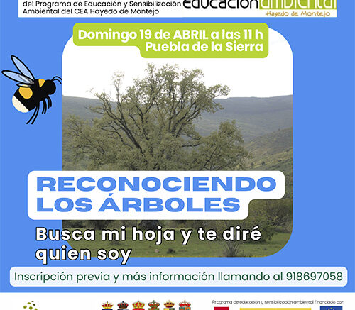 RECONOCIENDO LOS ÁRBOLES: Busca mi hoja y te diré quien soy en Puebla Publicado por: senda_norte 09/04/2026Domingo 19 de ABRIL a las 11 h Puebla de la SierraACTIVIDADES TEMÁTICASdel Programa de Educación y SensibilizaciónAmbiental del CEA Hayedo de MontejoInscripción previa y más información llamando al 918697058