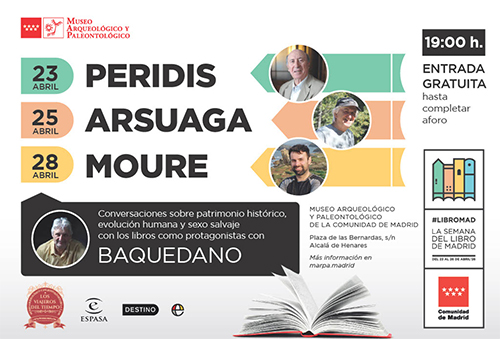 Ciclo de conversaciones con escritores organizado por el Museo Arqueológico y Paleontológico de la Comunidad de Madrid (MARPA) los días 23, 25 y 28 de abril con motivo de la Semana del Libro de Madrid – LIBROMAD. La iniciativa contará con la participación de José Mª Pérez ‘Peridis’, Juan Luis Arsuaga y Ricardo Moure. Todos los encuentros contarán con la presencia del director del museo, Enrique Baquedano, quien conversará con los invitados sobre patrimonio histórico, evolución humana y biología respectivamente.