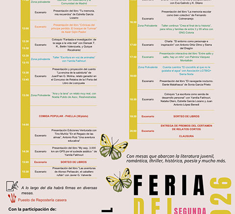La programación incluye presentaciones de libros, cuentacuentos, talleres de escritura, coloquios literarios, actividades para familias y sorteos de libros a lo largo del día. La jornada arrancará con una lectura poética dramatizada a cargo del Grupo de Teatro Arcoiris y cerrará con la entrega de premios del Certamen de Relatos Cortos. Además, habrá firmas de autor, exposición y venta de libros de los más variados géneros literarios y un puesto de repostería casera.